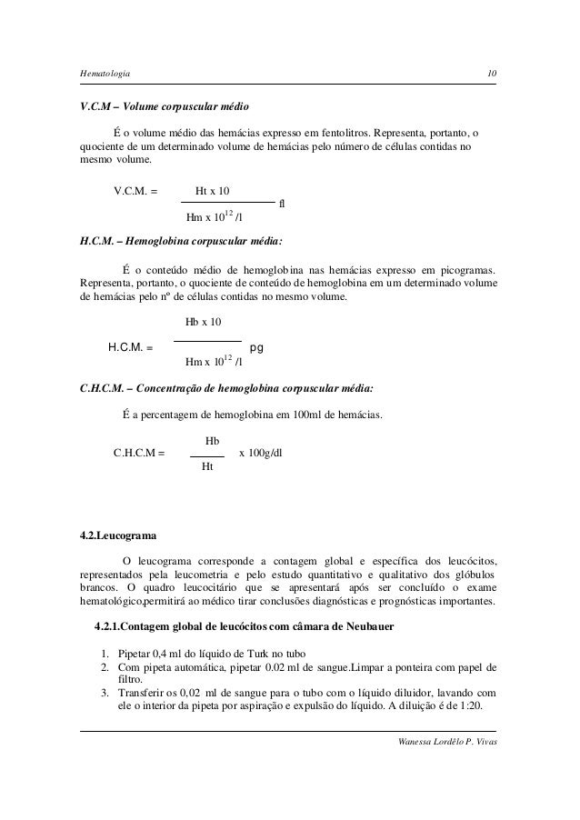 10. 10. Hematologia 10V.C.M – Volume corpuscular médio É o volume médio das hemácias expresso em fentolitros. Representa, portanto, oquociente de um determinado volume de hemácias pelo número de células contidas nomesmo volume. V.C.M. = Ht x 10 fl Hm x 1012 /lH.C.M. – Hemoglobina corpuscular média: É o conteúdo médio de hemoglob ina nas hemácias expresso em picogramas.Representa, portanto, o quociente de conteúdo de hemoglobina em um determinado volumede hemácias pelo nº de células contidas no mesmo volume. Hb x 10 H.C.M. = pg Hm x 1012 /lC.H.C.M. – Concentração de hemoglobina corpuscular média: É a percentagem de hemoglobina em 100ml de hemácias. Hb C.H.C.M = x 100g/dl Ht4.2.Leucograma O leucograma corresponde a contagem global e específica dos leucócitos,representados pela leucometria e pelo estudo quantitativo e qualitativo dos glóbulosbrancos. O quadro leucocitário que se apresentará após ser concluído o examehematológico,permitirá ao médico tirar conclusões diagnósticas e prognósticas importantes. 4.2.1.Contagem global de leucócitos com câmara de Neubauer 1. Pipetar 0,4 ml do líquido de Turk no tubo 2. Com pipeta automática, pipetar 0.02 ml de sangue.Limpar a ponteira com papel de filtro. 3. Transferir os 0,02 ml de sangue para o tubo com o líquido diluidor, lavando com ele o interior da pipeta por aspiração e expulsão do líquido. A diluição é de 1:20. Wanessa Lordêlo P. Vivas