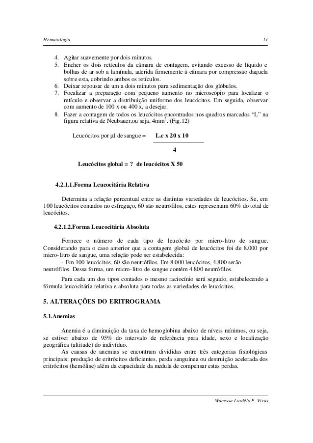 11. 11. Hematologia 11 4. Agitar suavemente por dois minutos. 5. Encher os dois retículos da câmara de contagem, evitando excesso de líquido e bolhas de ar sob a lamínula, aderida firmemente à câmara por compressão daquela sobre esta, cobrindo ambos os retículos. 6. Deixar repousar de um a dois minutos para sedimentação dos glóbulos. 7. Focalizar a preparação com pequeno aumento no microscópio para localizar o retículo e observar a distribuição uniforme dos leucócitos. Em seguida, observar com aumento de 100 x ou 400 x, a desejar. 8. Fazer a contagem de todos os leucócitos encontrados nos quadros marcados “L” na figura relativa de Neubauer,ou seja, 4mm2 . (Fig.12) Leucócitos por µl de sangue = L.c x 20 x 10 4 Leucócitos global = ? de leucócitos X 50 4.2.1.1.Forma Leucocitária Relativa Determina a relação percentual entre as distintas variedades de leucócitos. Se, em100 leucócitos contados no esfregaço, 60 são neutrófilos, estes representam 60% do total deleucócitos. 4.2.1.2.Forma Leucocitária Absoluta Fornece o número de cada tipo de leucócito por micro-litro de sangue.Considerando para o caso anterior que a contagem global de leucócitos foi de 8.000 pormicro- litro de sangue, uma relação pode ser estabelecida: - Em 100 leucócitos, 60 são neutrófilos. Em 8.000 leucócitos, 4.800 serãoneutrófilos. Dessa forma, um micro-litro de sangue contém 4.800 neutrófilos. Para cada um dos tipos contados o mesmo raciocínio será seguido, estabelecendo afórmula leucocitária relativa e absoluta para todas as variedades de leucócitos.5. ALTERAÇÕES DO ERITROGRAMA5.1.Anemias Anemia é a diminuição da taxa de hemoglobina abaixo de níveis mínimos, ou seja,se estiver abaixo de 95% do intervalo de referência para idade, sexo e localizaçãogeográfica (altitude) do indivíduo. As causas de anemias se encontram divididas entre três categorias fisiológicasprincipais: produção de eritrócitos deficientes, perda sanguínea ou destruição acelerada doseritrócitos (hemólise) além da capacidade da medula de compensar estas perdas. Wanessa Lordêlo P. Vivas