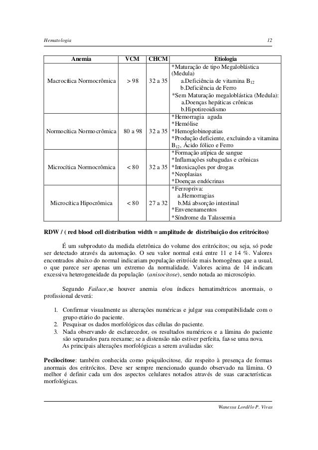 12. 12. Hematologia 12 Anemia VCM CHCM Etiologia *Maturação de tipo Megaloblástica (Medula) Macrocítica Normocrômica > 98 32 a 35 a.Deficiência de vitamina B12 b.Deficiência de Ferro *Sem Maturação megaloblástica (Medula): a.Doenças hepáticas crônicas b.Hipotireoidismo *Hemorragia aguda *HemóliseNormocítica Normo crômica 80 a 98 32 a 35 *Hemoglobinopatias *Produção deficiente, excluindo a vitamina B12 , Ácido fólico e Ferro *Formação atípica de sangue *Inflamações subagudas e crônicas Microcítica Normocrômica < 80 32 a 35 *Intoxicações por drogas *Neoplasias *Doenças endócrinas *Ferropriva: a.Hemorragias Microcítica Hipocrômica < 80 27 a 32 b.Má absorção intestinal *Envenenamentos *Síndrome da TalassemiaRDW / ( red blood cell distribution width = amplitude de distribuição dos eritrócitos) É um subproduto da medida eletrônica do volume dos eritrócitos; ou seja, só podeser detectado através da automação. O seu valor normal está entre 11 e 14 %. Valoresencontrados abaixo do normal indicariam população eritróide mais homogênea que a usual,o que parece ser apenas um extremo da normalidade. Valores acima de 14 indicamexcessiva heterogeneidade da população (anisocitose), sendo notada ao microscópio. Segundo Failace,se houver anemia e/ou índices hematimétricos anormais, oprofissional deverá: 1. Confirmar visualmente as alterações numéricas e julgar sua compatibilidade com o grupo etário do paciente. 2. Pesquisar os dados morfológicos das células do paciente. 3. Nada observando de esclarecedor, os resultados numéricos e a lâmina do paciente são separados para reexame; se a distensão não estiver perfeita, faz-se uma nova. As principais alterações morfológicas a serem avaliadas são:Pecilocitose: também conhecida como poiquilocitose, diz respeito à presença de formasanormais dos eritrócitos. Deve ser sempre mencionado quando observado na lâmina. Omelhor é definir cada um dos aspectos celulares notados através de suas característicasmorfológicas. Wanessa Lordêlo P. Vivas