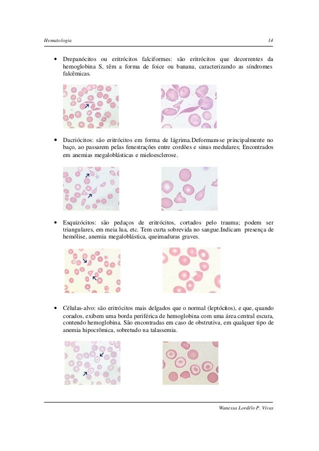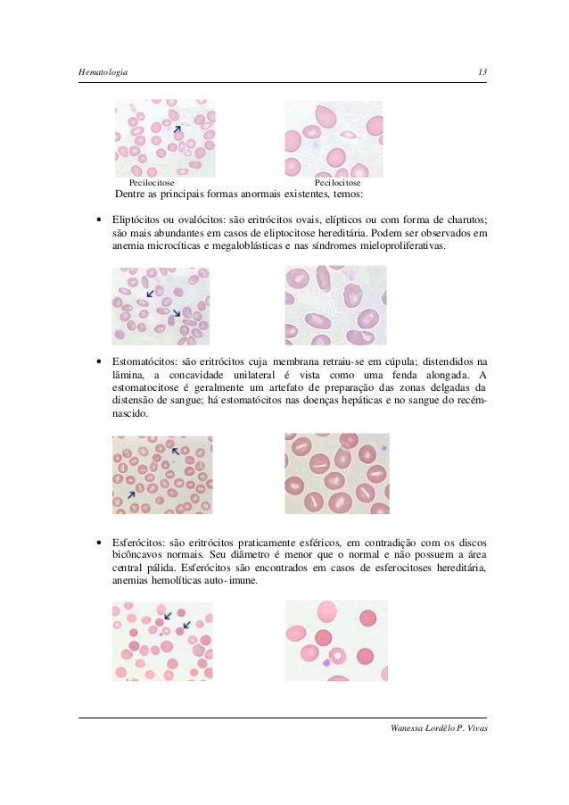 13. 13. Hematologia 13 Pecilocitose Pecilocitose Dentre as principais formas anormais existentes, temos: • Eliptócitos ou ovalócitos: são eritrócitos ovais, elípticos ou com forma de charutos; são mais abundantes em casos de eliptocitose hereditária. Podem ser observados em anemia microcíticas e megaloblásticas e nas síndromes mieloproliferativas. • Estomatócitos: são eritrócitos cuja membrana retraiu-se em cúpula; distendidos na lâmina, a concavidade unilateral é vista como uma fenda alongada. A estomatocitose é geralmente um artefato de preparação das zonas delgadas da distensão de sangue; há estomatócitos nas doenças hepáticas e no sangue do recém- nascido. • Esferócitos: são eritrócitos praticamente esféricos, em contradição com os discos bicôncavos normais. Seu diâmetro é menor que o normal e não possuem a área central pálida. Esferócitos são encontrados em casos de esferocitoses hereditária, anemias hemolíticas auto- imune. Wanessa Lordêlo P. Vivas