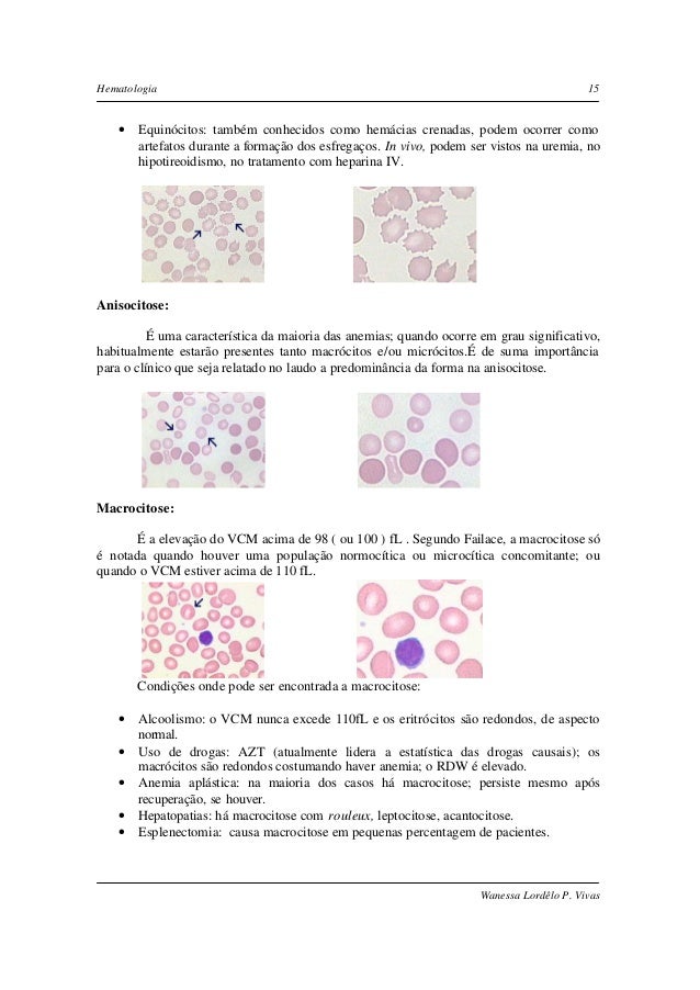 15. 15. Hematologia 15 • Equinócitos: também conhecidos como hemácias crenadas, podem ocorrer como artefatos durante a formação dos esfregaços. In vivo, podem ser vistos na uremia, no hipotireoidismo, no tratamento com heparina IV.Anisocitose: É uma característica da maioria das anemias; quando ocorre em grau significativo,habitualmente estarão presentes tanto macrócitos e/ou micrócitos.É de suma importânciapara o clínico que seja relatado no laudo a predominância da forma na anisocitose.Macrocitose: É a elevação do VCM acima de 98 ( ou 100 ) fL . Segundo Failace, a macrocitose sóé notada quando houver uma população normocítica ou microcítica concomitante; ouquando o VCM estiver acima de 110 fL. Condições onde pode ser encontrada a macrocitose: • Alcoolismo: o VCM nunca excede 110fL e os eritrócitos são redondos, de aspecto normal. • Uso de drogas: AZT (atualmente lidera a estatística das drogas causais); os macrócitos são redondos costumando haver anemia; o RDW é elevado. • Anemia aplástica: na maioria dos casos há macrocitose; persiste mesmo após recuperação, se houver. • Hepatopatias: há macrocitose com rouleux, leptocitose, acantocitose. • Esplenectomia: causa macrocitose em pequenas percentagem de pacientes. Wanessa Lordêlo P. Vivas