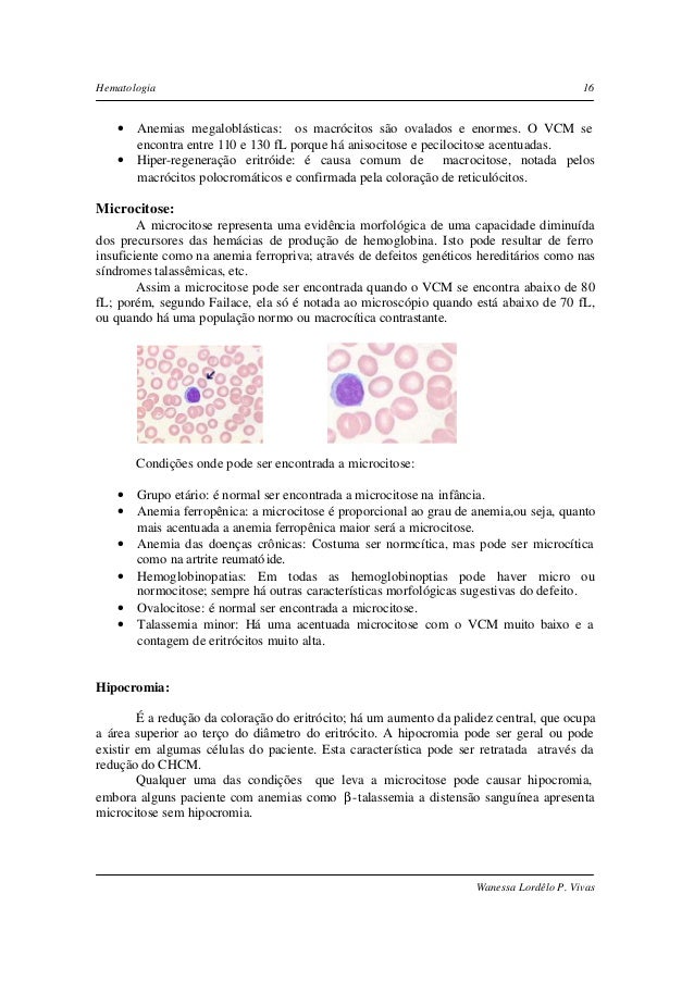 16. 16. Hematologia 16 • Anemias megaloblásticas: os macrócitos são ovalados e enormes. O VCM se encontra entre 110 e 130 fL porque há anisocitose e pecilocitose acentuadas. • Hiper-regeneração eritróide: é causa comum de macrocitose, notada pelos macrócitos polocromáticos e confirmada pela coloração de reticulócitos.Microcitose: A microcitose representa uma evidência morfológica de uma capacidade diminuídados precursores das hemácias de produção de hemoglobina. Isto pode resultar de ferroinsuficiente como na anemia ferropriva; através de defeitos genéticos hereditários como nassíndromes talassêmicas, etc. Assim a microcitose pode ser encontrada quando o VCM se encontra abaixo de 80fL; porém, segundo Failace, ela só é notada ao microscópio quando está abaixo de 70 fL,ou quando há uma população normo ou macrocítica contrastante. Condições onde pode ser encontrada a microcitose: • Grupo etário: é normal ser encontrada a microcitose na infância. • Anemia ferropênica: a microcitose é proporcional ao grau de anemia,ou seja, quanto mais acentuada a anemia ferropênica maior será a microcitose. • Anemia das doenças crônicas: Costuma ser normcítica, mas pode ser microcítica como na artrite reumató ide. • Hemoglobinopatias: Em todas as hemoglobinoptias pode haver micro ou normocitose; sempre há outras características morfológicas sugestivas do defeito. • Ovalocitose: é normal ser encontrada a microcitose. • Talassemia minor: Há uma acentuada microcitose com o VCM muito baixo e a contagem de eritrócitos muito alta.Hipocromia: É a redução da coloração do eritrócito; há um aumento da palidez central, que ocupaa área superior ao terço do diâmetro do eritrócito. A hipocromia pode ser geral ou podeexistir em algumas células do paciente. Esta característica pode ser retratada através daredução do CHCM. Qualquer uma das condições que leva a microcitose pode causar hipocromia,embora alguns paciente com anemias como β-talassemia a distensão sanguínea apresentamicrocitose sem hipocromia. Wanessa Lordêlo P. Vivas
