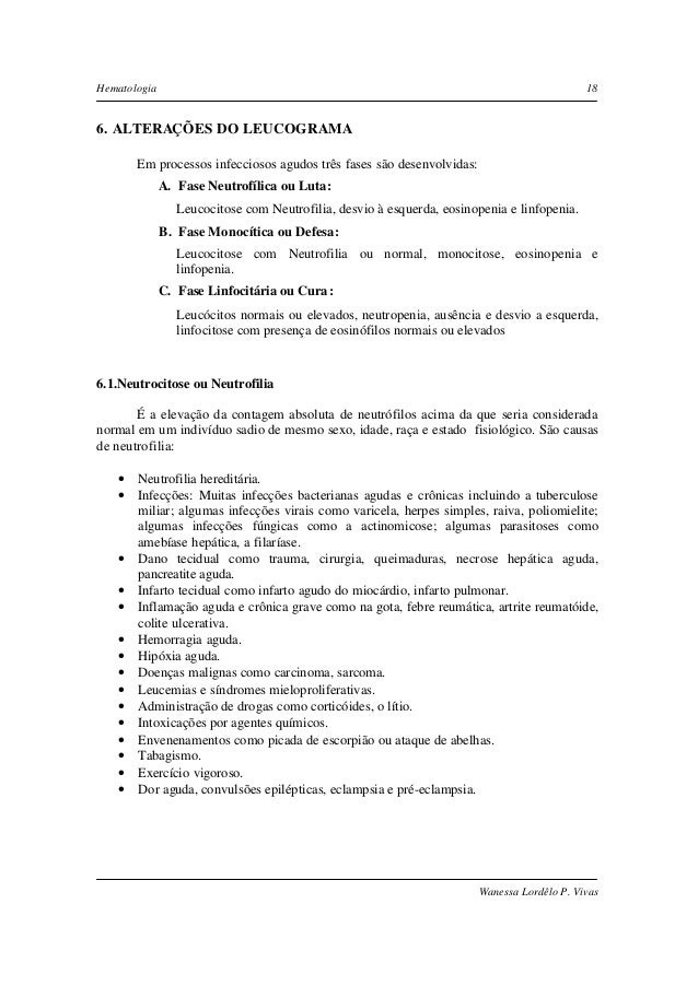 18. 18. Hematologia 186. ALTERAÇÕES DO LEUCOGRAMA Em processos infecciosos agudos três fases são desenvolvidas: A. Fase Neutrofílica ou Luta: Leucocitose com Neutrofilia, desvio à esquerda, eosinopenia e linfopenia. B. Fase Monocítica ou Defesa: Leucocitose com Neutrofilia ou normal, monocitose, eosinopenia e linfopenia. C. Fase Linfocitária ou Cura : Leucócitos normais ou elevados, neutropenia, ausência e desvio a esquerda, linfocitose com presença de eosinófilos normais ou elevados6.1.Neutrocitose ou Neutrofilia É a elevação da contagem absoluta de neutrófilos acima da que seria consideradanormal em um indivíduo sadio de mesmo sexo, idade, raça e estado fisiológico. São causasde neutrofilia: • Neutrofilia hereditária. • Infecções: Muitas infecções bacterianas agudas e crônicas incluindo a tuberculose miliar; algumas infecções virais como varicela, herpes simples, raiva, poliomielite; algumas infecções fúngicas como a actinomicose; algumas parasitoses como amebíase hepática, a filaríase. • Dano tecidual como trauma, cirurgia, queimaduras, necrose hepática aguda, pancreatite aguda. • Infarto tecidual como infarto agudo do miocárdio, infarto pulmonar. • Inflamação aguda e crônica grave como na gota, febre reumática, artrite reumatóide, colite ulcerativa. • Hemorragia aguda. • Hipóxia aguda. • Doenças malignas como carcinoma, sarcoma. • Leucemias e síndromes mieloproliferativas. • Administração de drogas como corticóides, o lítio. • Intoxicações por agentes químicos. • Envenenamentos como picada de escorpião ou ataque de abelhas. • Tabagismo. • Exercício vigoroso. • Dor aguda, convulsões epilépticas, eclampsia e pré-eclampsia. Wanessa Lordêlo P. Vivas