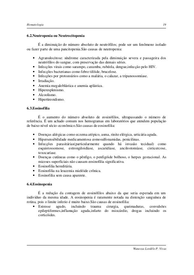 19. 19. Hematologia 196.2.Neutropenia ou Neutrocitopenia É a diminuição do número absoluto de neutrófilos; pode ser um fenômeno isoladoou fazer parte de uma pancitopenia.São causas de neutropenia: • Agranulocitose: síndrome caracterizada pela diminuição severa e passageira dos neutrófilos do sangue, com preservação das demais séries. • Infecções virais como sarampo, caxumba, rubéola, dengue,infecção pelo HIV. • Infecções bacterianas como febre tifóide, brucelose. • Infecções por protozoários como a malária, o calazar, a tripanossomíase. • Irradiação. • Anemia megaloblástica e anemia aplástica. • Hiperesplenismo. • Alcoolismo. • Hipertireoidismo.6.3.Eosinofilia É o aumento do número absoluto de eosinófilos, ultrapassando o número dereferência. É um achado comum nos hemogramas em laboratórios que atendem populaçãode baixo nível sócio-econômico.São causas de eosinofilia: • Doenças alérgicas como eczema atópico, asma, rinite elérgica, urticária aguda. • Hipersensibilidade medicamentosa comosulfonamidas, penicilinas. • Infecções parasitárias(particularmente quando há invasão tecidual) como esquistossomose, estrongiloidíase, ascaridíase, ancilostomíase, cisticercose, toxocaríase. • Doenças cutâneas como o pênfigo, o penfigóide bolhoso, o herpes gestacional. As micoses superficiais não causam eosinofilia significativa. • Eosinofilia hereditária. • Eosinofilia na leucemia mielóide crônica. • Eosinofilia sem causa aparente.6.4.Eosinopenia É a redução da contagem de eosinófilos abaixo da que seria esperada em umindivíduo da mesma idade. A eosinopenia é raramente notada na distenção sanguínea derotina, pois o limite inferio é muito baixo.São causas de eosinofilia: • Estresse agudo, incluindo trauma cirurgia, queimaduras, convulsões epileptiformes,inflamação aguda,infarto do miocárdio, drogas incluindo os corticóides. Wanessa Lordêlo P. Vivas