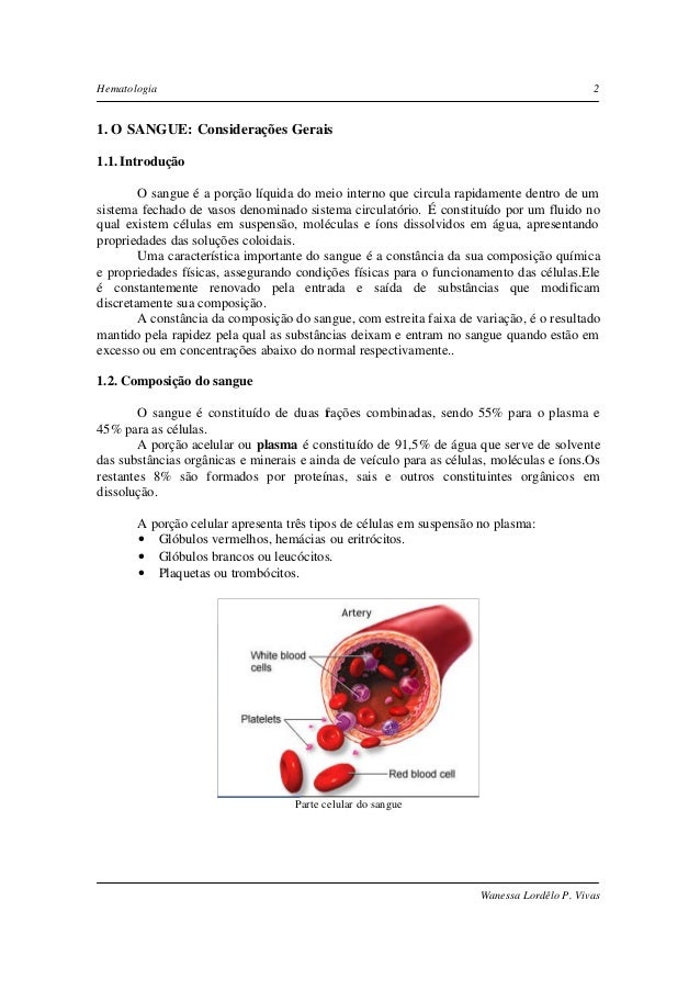 2. 2. Hematologia 21. O SANGUE: Considerações Gerais1.1. Introdução O sangue é a porção líquida do meio interno que circula rapidamente dentro de umsistema fechado de vasos denominado sistema circulatório. É constituído por um fluido noqual existem células em suspensão, moléculas e íons dissolvidos em água, apresentandopropriedades das soluções coloidais. Uma característica importante do sangue é a constância da sua composição químicae propriedades físicas, assegurando condições físicas para o funcionamento das células.Eleé constantemente renovado pela entrada e saída de substâncias que modificamdiscretamente sua composição. A constância da composição do sangue, com estreita faixa de variação, é o resultadomantido pela rapidez pela qual as substâncias deixam e entram no sangue quando estão emexcesso ou em concentrações abaixo do normal respectivamente..1.2. Composição do sangue O sangue é constituído de duas f ações combinadas, sendo 55% para o plasma e r45% para as células. A porção acelular ou plasma é constituído de 91,5% de água que serve de solventedas substâncias orgânicas e minerais e ainda de veículo para as células, moléculas e íons.Osrestantes 8% são formados por proteínas, sais e outros constituintes orgânicos emdissolução. A porção celular apresenta três tipos de células em suspensão no plasma: • Glóbulos vermelhos, hemácias ou eritrócitos. • Glóbulos brancos ou leucócitos. • Plaquetas ou trombócitos. Parte celular do sangue Wanessa Lordêlo P. Vivas