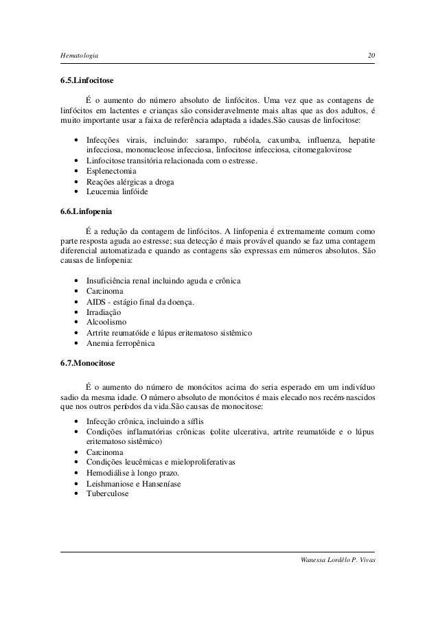 20. 20. Hematologia 206.5.Linfocitose É o aumento do número absoluto de linfócitos. Uma vez que as contagens delinfócitos em lactentes e crianças são consideravelmente mais altas que as dos adultos, émuito importante usar a faixa de referência adaptada a idades.São causas de linfocitose: • Infecções virais, incluindo: sarampo, rubéola, caxumba, influenza, hepatite infecciosa, mononucleose infecciosa, linfocitose infecciosa, citomegalovirose • Linfocitose transitória relacionada com o estresse. • Esplenectomia • Reações alérgicas a droga • Leucemia linfóide6.6.Linfopenia É a redução da contagem de linfócitos. A linfopenia é extremamente comum comoparte resposta aguda ao estresse; sua detecção é mais provável quando se faz uma contagemdiferencial automatizada e quando as contagens são expressas em números absolutos. Sãocausas de linfopenia: • Insuficiência renal incluindo aguda e crônica • Carcinoma • AIDS - estágio final da doença. • Irradiação • Alcoolismo • Artrite reumatóide e lúpus eritematoso sistêmico • Anemia ferropênica6.7.Monocitose É o aumento do número de monócitos acima do seria esperado em um indivíduosadio da mesma idade. O número absoluto de monócitos é mais elecado nos recém-nascidosque nos outros períodos da vida.São causas de monocitose: • Infecção crônica, incluindo a síflis • Condições inflamatórias crônicas ( olite ulcerativa, artrite reumatóide e o lúpus c eritematoso sistêmico) • Carcinoma • Condições leucêmicas e mieloproliferativas • Hemodiálise à longo prazo. • Leishmaniose e Hanseníase • Tuberculose Wanessa Lordêlo P. Vivas