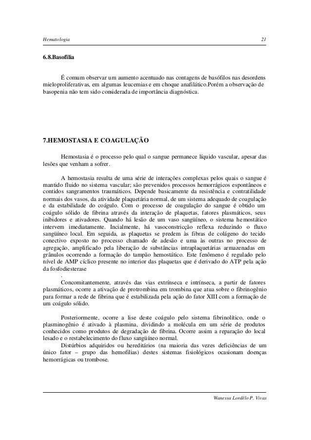 21. 21. Hematologia 216.8.Basofilia É comum observar um aumento acentuado nas contagens de basófilos nas desordensmieloproliferativas, em algumas leucemias e em choque anafilático.Porém a observação debasopenia não tem sido considerada de importância diagnóstica.7.HEMOSTASIA E COAGULAÇÃO Hemostasia é o processo pelo qual o sangue permanece líquido vascular, apesar daslesões que venham a sofrer. A hemostasia resulta de uma série de interações complexas pelos quais o sangue émantido fluido no sistema vascular; são prevenidos processos hemorrágicos espontâneos econtidos sangramentos traumáticos. Depende basicamente da resistência e contratilidadenormais dos vasos, da atividade plaquetária normal, de um sistema adequado de coagulaçãoe da estabilidade do coágulo. Com o processo de coagulação do sangue é obtido umcoágulo sólido de fibrina através da interação de plaquetas, fatores plasmáticos, seusinibidores e ativadores. Quando há lesão de um vaso sangüíneo, o sistema he mostáticointervem imediatamente. Incialmente, há vasoconstricção reflexa reduzindo o fluxosangüíneo local. Em seguida, as plaquetas se predem às fibras de colágeno do tecidoconectivo exposto no processo chamado de adesão e uma às outras no processo deagregação, amplificado pela liberação de substâncias intraplaquetárias armazenadas emgrânulos ocorrendo a formação do tampão hemostático. Este fenômeno é regulado pelonível de AMP cíclico presente no interior das plaquetas que é derivado do ATP pela açãoda fosfodiesterase . Concomitantemente, através das vias extrínseca e intrínseca, a partir de fatoresplasmáticos, ocorre a ativação de protrombina em trombina que atua sobre o fibrinogêniopara formar a rede de fibrina que é estabilizada pela ação do fator XIII com a formação deum coágulo sólido. Posteriormente, ocorre a lise deste coágulo pelo sistema fibrinolítico, onde oplasminogênio é ativado à plasmina, dividindo a molécula em um série de produtosconhecidos como produtos de degradação de fibrina. Ocorre assim a reparação do locallesado e o restabelecimento do fluxo sangüíneo normal. Distúrbios adquiridos ou hereditários (na maioria das vezes deficiências de umúnico fator – grupo das hemofilias) destes sistemas fisiológicos ocasionam doençashemorrágicas ou trombose. Wanessa Lordêlo P. Vivas