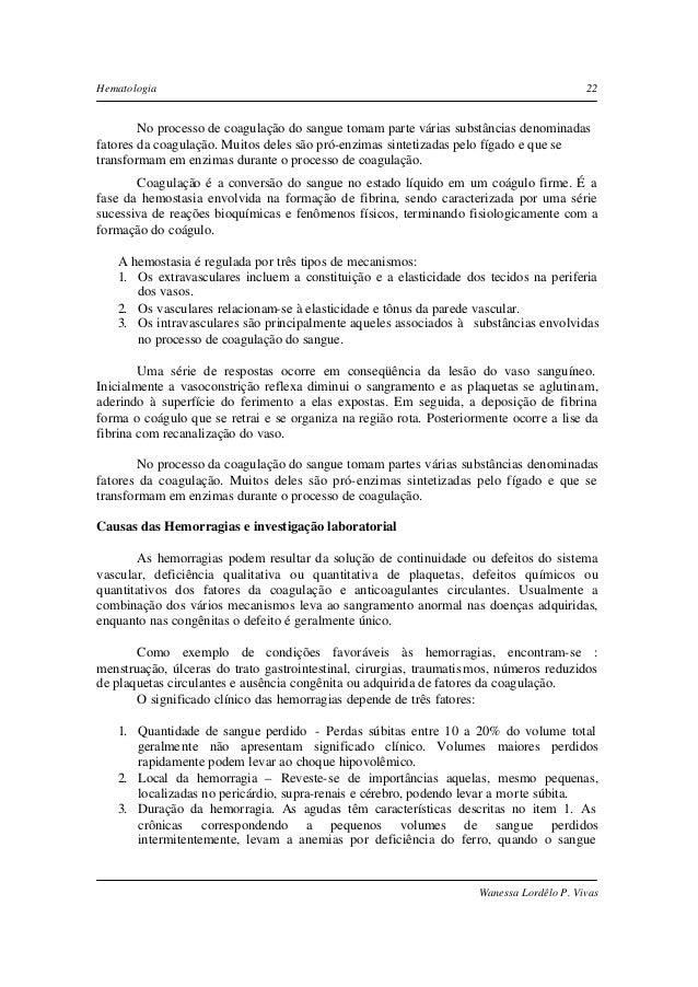 22. 22. Hematologia 22 No processo de coagulação do sangue tomam parte várias substâncias denominadasfatores da coagulação. Muitos deles são pró-enzimas sintetizadas pelo fígado e que setransformam em enzimas durante o processo de coagulação. Coagulação é a conversão do sangue no estado líquido em um coágulo firme. É afase da hemostasia envolvida na formação de fibrina, sendo caracterizada por uma sériesucessiva de reações bioquímicas e fenômenos físicos, terminando fisiologicamente com aformação do coágulo. A hemostasia é regulada por três tipos de mecanismos: 1. Os extravasculares incluem a constituição e a elasticidade dos tecidos na periferia dos vasos. 2. Os vasculares relacionam-se à elasticidade e tônus da parede vascular. 3. Os intravasculares são principalmente aqueles associados à substâncias envolvidas no processo de coagulação do sangue. Uma série de respostas ocorre em conseqüência da lesão do vaso sanguíneo.Inicialmente a vasoconstrição reflexa diminui o sangramento e as plaquetas se aglutinam,aderindo à superfície do ferimento a elas expostas. Em seguida, a deposição de fibrinaforma o coágulo que se retrai e se organiza na região rota. Posteriormente ocorre a lise dafibrina com recanalização do vaso. No processo da coagulação do sangue tomam partes várias substâncias denominadasfatores da coagulação. Muitos deles são pró-enzimas sintetizadas pelo fígado e que setransformam em enzimas durante o processo de coagulação.Causas das Hemorragias e investigação laboratorial As hemorragias podem resultar da solução de continuidade ou defeitos do sistemavascular, deficiência qualitativa ou quantitativa de plaquetas, defeitos químicos ouquantitativos dos fatores da coagulação e anticoagulantes circulantes. Usualmente acombinação dos vários mecanismos leva ao sangramento anormal nas doenças adquiridas,enquanto nas congênitas o defeito é geralmente único. Como exemplo de condições favoráveis às hemorragias, encontram-se :menstruação, úlceras do trato gastrointestinal, cirurgias, traumatis mos, números reduzidosde plaquetas circulantes e ausência congênita ou adquirida de fatores da coagulação. O significado clínico das hemorragias depende de três fatores: 1. Quantidade de sangue perdido - Perdas súbitas entre 10 a 20% do volume total geralme nte não apresentam significado clínico. Volumes maiores perdidos rapidamente podem levar ao choque hipovolêmico. 2. Local da hemorragia – Reveste-se de importâncias aquelas, mesmo pequenas, localizadas no pericárdio, supra-renais e cérebro, podendo levar a mo rte súbita. 3. Duração da hemorragia. As agudas têm características descritas no item 1. As crônicas correspondendo a pequenos volumes de sangue perdidos intermitentemente, levam a anemias por deficiência do ferro, quando o sangue Wanessa Lordêlo P. Vivas