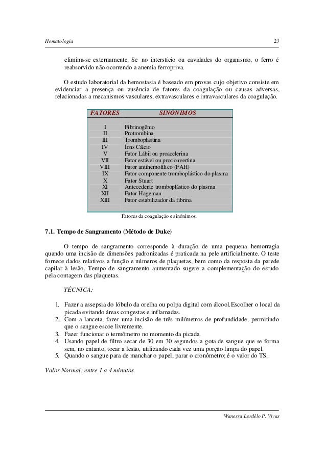 23. 23. Hematologia 23 elimina-se externamente. Se no interstício ou cavidades do organismo, o ferro é reabsorvido não ocorrendo a anemia ferropriva. O estudo laboratorial da hemostasia é baseado em provas cujo objetivo consiste em evidenciar a presença ou ausência de fatores da coagulação ou causas adversas, relacionadas a mecanismos vasculares, extravasculares e intravasculares da coagulação. FATORES SINÔNIMOS I Fibrinogênio II Protrombina III Tromboplastina IV Íons Cálcio V Fator Lábil ou proacelerina VII Fator estável ou proc onvertina VIII Fator antihemofílico (FAH) IX Fator componente tromboplástico do plasma X Fator Stuart XI Antecedente tromboplástico do plasma XII Fator Hageman XIII Fator estabilizador da fibrina Fatores da coagulação e sinônimos.7.1. Tempo de Sangramento (Método de Duke) O tempo de sangramento corresponde à duração de uma pequena hemorragiaquando uma incisão de dimensões padronizadas é praticada na pele artificialmente. O testefornece dados relativos a função e números de plaquetas, bem como da resposta da paredecapilar à lesão. Tempo de sangramento aumentado sugere a complementação do estudopela contagem das plaquetas. TÉCNICA: 1. Fazer a assepsia do lóbulo da orelha ou polpa digital com álcool.Escolher o local da picada evitando áreas congestas e inflamadas. 2. Com a lanceta, fazer uma incisão de três milímetros de profundidade, permitindo que o sangue escoe livremente. 3. Fazer funcionar o termômetro no momento da picada. 4. Usando papel de filtro secar de 30 em 30 segundos a gota de sangue que se forma sem, no entanto, tocar a lesão, utilizando cada vez uma porção limpa do papel. 5. Quando o sangue para de manchar o papel, parar o cronômetro; é o valor do TS.Valor Normal: entre 1 a 4 minutos. Wanessa Lordêlo P. Vivas