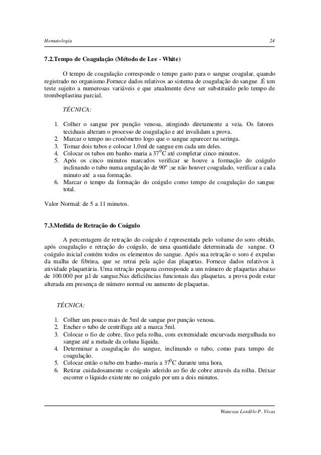 24. 24. Hematologia 247.2.Tempo de Coagulação (Método de Lee - White) O tempo de coagulação corresponde o tempo gasto para o sangue coagular, quandoregistrado no organismo.Fornece dados relativos ao sistema de coagulação do sangue .É umteste sujeito a numerosas variáveis e que atualmente deve ser substituído pelo tempo detromboplastina parcial. TÉCNICA: 1. Colher o sangue por punção venosa, atingindo diretamente a veia. Os fatores teciduais alteram o processo de coagulação e até invalidam a prova. 2. Marcar o tempo no cronômetro logo que o sangue aparecer na seringa. 3. Tomar dois tubos e colocar 1,0ml de sangue em cada um deles. 4. Colocar os tubos em banho- maria a 37 0 C até completar cinco minutos. 5. Após os cinco minutos marcados verificar se houve a formação do coágulo inclinando o tubo numa angulação de 90o ;se não houver coagulado, verificar a cada minuto até a sua formação. 6. Marcar o tempo da formação do coágulo como tempo de coagulação do sangue total.Valor Normal: de 5 a 11 minutos.7.3.Medida de Retração do Coágulo A percentagem de retração do coágulo é representada pelo volume do soro obtido,após coagulação e retração do coágulo, de uma quantidade determinada de sangue. Ocoágulo inicial contém todos os elementos do sangue. Após sua retração o soro é expulsoda malha de fibrina, que se retrai pela ação das plaquetas. Fornece dados relativos àatividade plaquetária. Uma retração pequena corresponde a um número de plaquetas abaixode 100.000 por µl de sangue.Nas deficiências funcionais das plaquetas, a prova pode estaralterada em presença de número normal ou aumento de plaquetas. TÉCNICA: 1. Colher um pouco mais de 5ml de sangue por punção venosa. 2. Encher o tubo de centrífuga até a marca 5ml. 3. Colocar o fio de cobre, fixo pela rolha, com extremidade encurvada mergulhada no sangue até a metade da coluna líquida. 4. Determinar a coagulação do sangue, inclinando o tubo, como para tempo de coagulação. 5. Colocar então o tubo em banho-maria a 370 C durante uma hora. 6. Retirar cuidadosamente o coágulo aderido ao fio de cobre através da rolha. Deixar escorrer o líquido existente no coágulo por um a dois minutos. Wanessa Lordêlo P. Vivas