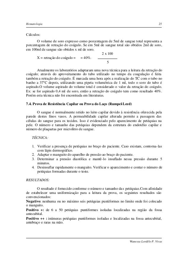 25. 25. Hematologia 25Cálculos: O volume de soro expresso como porcentagem de 5ml de sangue total representa aporcentagem de retração do coágulo. Se em 5ml de sangue total são obtidos 2ml de soro,em 100ml de sangue são obtidos x ml de soro. 2 x 100 X = retração do coágulo = = 40%. 5 Atualmente os laboratórios adaptaram uma nova técnica para a leitura da retração docoágulo; através do aproveitamento do tubo utilizado no tempo da coagulação é feitatambém a retração do coágulo. É marcada uma hora após a realização do TC com o tubo nobanho a 37o C depois, utilizando uma pipeta volumétrica de 1 ml, todo o soro do tubo éaspirado.O volume aspirado do volume total é considerado o valor da retração do coágulo.Ex: se for aspirado 0,4 ml de soro, então a retração do coágulo tem como resultado 40%.Porém esta técnica não foi encontrada em literaturas.7.4. Prova de Resistência Capilar ou Prova do Laço (Rumpel-Leed) O sangue é normalmente retido no leito capilar devido à resistência oferecida pelaparede destes finos vasos. A permeabilidade capilar alterada permite a passagem dascélulas do sangue para os tecidos. Isso é evidenciado pelo aparecimento de petéquias napele. O número e tamanho das petéquias dependem da estrutura do endotélio capilar enúmero de plaquetas por microlitro de sangue. TÉCNICA: 1. Verificar a presença de petéquias no braço do paciente. Caso existam, contorna-las com lápis dermográfico. 2. Adaptar o manguito do aparelho de pressão ao braço do paciente. 3. Determinar a pressão diastólica e mantê- lo insuflado nessa pressão durante 5 minutos. 4. Desinsuflar rapidamente o manguito. Verificar o aparecimento e contar o número de petéquias formadas durante o teste.RESULTADOS: O resultado é fornecido conforme o número e tamanho da s petéquias.Com afinidadede estabelecer uma uniformização para a leitura da prova, os seguintes resultados sãoconvencionados:Negativo: nenhuma ou no máximo seis petéquias puntiformes no limite onde foi colocadoo manguito.Positivo +: de 6 a 50 petéquias puntiformes isoladas localizadas na região da fossaantecubital.Positivo ++ : inúmeras petéquias puntiformes isoladas e localizadas na fossa antecubital,antebraço e raras na mão. Wanessa Lordêlo P. Vivas