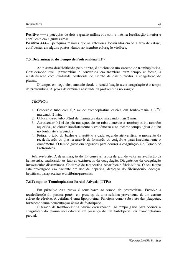 26. 26. Hematologia 26Positivo +++ : petéquias de dois a quatro milímetros com a mesma localização anterior econfluente em algumas áreas.Positivo ++++ : petéquias maiores que as anteriores localizadas em to a área de estase,confluentes em alguns pontos, dando ao membro coloração violácea.7.5. Determinação do Tempo de Protrombina (TP) Ao plasma descalcificado pelo citrato, é adicionado um excesso de tromboplastina.Considerando que protrombina é convertida em trombina num tempo uniforme, arecalcificação com qualidade conhecida de cloreto de cálcio produz a coagulação doplasma. O tempo, em segundos, anotado desde a recalcificação até a coagulação é o tempode protrombina. A prova determina a atividade da protrombina no sangue. TÉCNICA: 1. Colocar o tubo com 0,2 ml de tromboplastina cálcica em banho- maria a 370 C marcando 2 min. 2. Colocar outro tubo 0,2ml de plasma citratado marcando mais 2 min. 3. Acrescentar 0,1ml do plasma aquecido no tubo contendo a tromboplastina também aquecida., adicionar imediatamente o cronômetro e ao mesmo tempo agitar o tubo no banho até 7 segundos 4. Retirar o tubo do banho e invertê- lo a cada segundo até verificar o momento da recalcificacão do plasma através da formação do coágulo e parar imediatamente o cronômetro. O tempo gasto em segundos para ocorrer a coagulação é o Tempo de Protrombina. Interpretação: A determinação do TP constitui prova de grande valor na avaliação dahemostasia, analizando os fatores extrínsecos da coagulação. Diagnóstico da coagulaçãointravascular disseminada. Comtrole de terapêutica heparínica e fibrinolítica. O seu tempoestá prolongado em paciente em uso de heparina, depleção do fibrinogênio, doençashepáticas, paraproteínas e disfibrinogenemias7.6.Tempo de Tromboplastina Parcial Ativado (TTPa) Em princípio esta prova é semelhante ao tempo de protrombina. Envolve arecalcificação do plasma, porém em presença de uma cefalina proveniente de um extratoetéreo de cérebro. A cefalina é uma lipoproteína. Funciona como substituto das plaquetas,fornecendo uma concentração ótima de fosfolípede. O tempo de tromboplastina parcial corresponde ao tempo gasto para ocorrer acoagulação do plasma recalcificado em presença de um fosfolípede ou tromboplastinaparcial. Wanessa Lordêlo P. Vivas