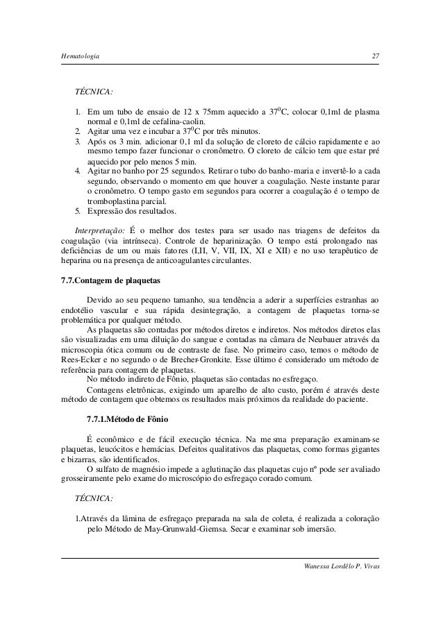 27. 27. Hematologia 27 TÉCNICA: 1. Em um tubo de ensaio de 12 x 75mm aquecido a 370 C, colocar 0,1ml de plasma normal e 0,1ml de cefalina-caolin. 2. Agitar uma vez e incubar a 370 C por três minutos. 3. Após os 3 min. adicionar 0,1 ml da solução de cloreto de cálcio rapidamente e ao mesmo tempo fazer funcionar o cronômetro. O cloreto de cálcio tem que estar pré aquecido por pelo menos 5 min. 4. Agitar no banho por 25 segundos. Retirar o tubo do banho-maria e invertê-lo a cada segundo, observando o momento em que houver a coagulação. Neste instante parar o cronômetro. O tempo gasto em segundos para ocorrer a coagulação é o tempo de tromboplastina parcial. 5. Expressão dos resultados. Interpretação: É o melhor dos testes para ser usado nas triagens de defeitos dacoagulação (via intrínseca). Controle de heparinização. O tempo está prolongado nasdeficiências de um ou mais fato res (I,II, V, VII, IX, XI e XII) e no uso terapêutico deheparina ou na presença de anticoagulantes circulantes.7.7.Contagem de plaquetas Devido ao seu pequeno tamanho, sua tendência a aderir a superfícies estranhas aoendotélio vascular e sua rápida desintegração, a contagem de plaquetas torna-seproblemática por qualquer método. As plaquetas são contadas por métodos diretos e indiretos. Nos métodos diretos elassão visualizadas em uma diluição do sangue e contadas na câmara de Neubauer através damicroscopia ótica comum ou de contraste de fase. No primeiro caso, temos o método deRees-Ecker e no segundo o de Brecher-Gronkite. Esse último é considerado um método dereferência para contagem de plaquetas. No método indireto de Fônio, plaquetas são contadas no esfregaço. Contagens eletrônicas, exigindo um aparelho de alto custo, porém é através destemétodo de contagem que obtemos os resultados mais próximos da realidade do paciente. 7.7.1.Método de Fônio É econômico e de fácil execução técnica. Na me sma preparação examinam-seplaquetas, leucócitos e hemácias. Defeitos qualitativos das plaquetas, como formas gigantese bizarras, são identificados. O sulfato de magnésio impede a aglutinação das plaquetas cujo nº pode ser avaliadogrosseiramente pelo exame do microscópio do esfregaço corado comum. TÉCNICA: 1.Através da lâmina de esfregaço preparada na sala de coleta, é realizada a coloração pelo Método de May-Grunwald-Giemsa. Secar e examinar sob imersão. Wanessa Lordêlo P. Vivas