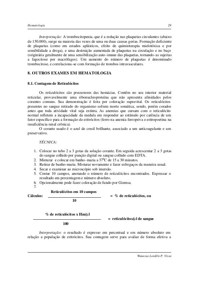 29. 29. Hematologia 29 Interpretação: A trombocitopenia, que é a redução nas plaquetas circulantes (abaixode 150.000), surge na maioria das vezes de uma ou duas causas gerias. Formação deficientede plaquetas (como em estados aplásticos, efeito de quimioterapia mielotóxica e porsensibilidade a droga), e uma destruição aumentada de plaquetas na circulação e no baço(originária geralmente de uma sensibilização auto- imune das plaquetas, tornando-as sujeitasa fagocitose por macrófagos). Um aumento do número de plaquetas é denominadotrombocitose, e correlaciona-se com formação de trombos intravasculares.8. OUTROS EXAMES EM HEMATOLOGIA8.1. Contagem de Reticulócitos Os reticulócitos são precursores das hemácias. Contêm no seu interior materialreticular, provavelmente uma ribonucleoproteína que não apresenta afinidades peloscorantes comuns. Sua demonstração é feita por coloração supravital. Os reticulócitospresentes no sangue retirado do organismo sofrem morte somática, sendo, porém coradosantes que toda atividade vital seja extinta. As anemias que cursam com o reticulócitonormal refletem a incapacidade da medula em responder ao estímulo por carência de umfator específico para a formação de eritrócitos (ferro na anemia ferropriva e eritropoetina nainsuficiência renal crônica). O corante usado é o azul de cresil brilhante, associado a um anticoagulante e umpreservativo. TÉCNICA: 1. Colocar no tubo 2 a 3 gotas da solução corante. Em seguida acrescentar 2 a 3 gotas do sangue colhido por punção digital ou sangue colhido com EDTA. 2. Misturar e colocar em banho- maria a 370C de 15 a 30 minutos. 3. Retirar de banho-maria. Misturar novamente e fazer esfregaços da maneira usual. 4. Secar e examinar ao microscópio sob imersão. 5. Contar 10 campos, anotando o número de reticulócitos encontrados. Expressar o resultado em percentagem e número absoluto. 6. Opcionalmente pode fazer coloração de fundo por Giemsa. 7. Reticulócitos em 10 camposCálculos: = % de reticulócitos, ou 10 % de reticulócitos x Hm/µl = reticulócitos/µl de sangue 100 Interpretação: o resultado é expresso em percentual e em número absoluto emrelação a população de eritrócitos. Sua contagem serve para avaliar de forma efetiva a Wanessa Lordêlo P. Vivas