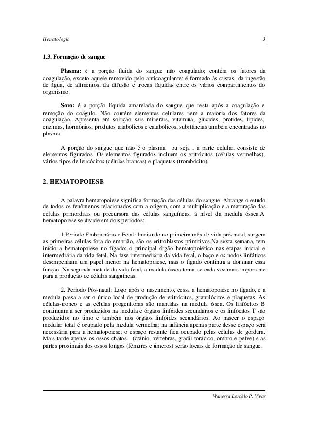 3. 3. Hematologia 31.3. Formação do sangue Plasma: è a porção fluida do sangue não coagulado; contém os fatores dacoagulação, exceto aquele removido pelo anticoagulante; é formado às custas da ingestãode água, de alimentos, da difusão e trocas líquidas entre os vários compartimentos doorganismo. Soro: é a porção líquida amarelada do sangue que resta após a coagulação eremoção do coágulo. Não contém elementos celulares nem a maioria dos fatores dacoagulação. Apresenta em solução sais minerais, vitamina, glúcides, prótides, lípides,enzimas, hormônios, produtos anabólicos e catabólicos, substâncias também encontradas noplasma. A porção do sangue que não é o plasma ou seja , a parte celular, consiste deelementos figurados. Os elementos figurados incluem os eritrócitos (células vermelhas),vários tipos de leucócitos (células brancas) e plaquetas (trombócito).2. HEMATOPOIESE A palavra hematopoiese significa formação das células do sangue. Abrange o estudode todos os fenômenos relacionados com a origem, com a multiplicação e a maturação dascélulas primordiais ou precursora das células sanguíneas, à nível da medula óssea.Ahematopoiese se divide em dois períodos: 1.Período Embrionário e Fetal: Iniciando no primeiro mês de vida pré- natal, surgemas primeiras células fora do embrião, são os eritroblastos primitivos.Na sexta semana, teminício a hematopoiese no fígado; o principal órgão hematopoiético nas etapas inicial eintermediária da vida fetal. Na fase intermediária da vida fetal, o baço e os nodos linfáticosdesempenham um papel menor na hematopoiese, mas o fígado continua a dominar essafunção. Na segunda metade da vida fetal, a medula óssea torna-se cada vez mais importantepara a produção de células sanguíneas. 2. Período Pós-natal: Logo após o nascimento, cessa a hematopoiese no fígado, e amedula passa a ser o único local de produção de eritrócitos, granulócitos e plaquetas. Ascélulas-tronco e as células progenitoras são mantidas na medula ó ssea. Os linfócitos Bcontinuam a ser produzidos na medula e órgãos linfóides secundários e os linfócitos T sãoproduzidos no timo e também nos órgãos linfóides secundários. Ao nascer o espaçomedular total é ocupado pela medula vermelha; na infância apenas parte desse espaço seránecessária para a hematopoiese; o espaço restante fica ocupado pelas células de gordura.Mais tarde apenas os ossos chatos (crânio, vértebras, gradil torácico, ombro e pelve) e aspartes proximais dos ossos longos (fêmures e úmeros) serão locais de formação de sangue. Wanessa Lordêlo P. Vivas
