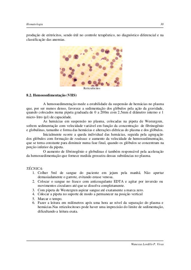 30. 30. Hematologia 30produção de eritrócitos, sendo útil no controle terapêutico, no diagnóstico diferencial e naclassificação das anemias. Reticulócitos8.2. Hemossedimentação (VHS) A hemossedimentação mede a estabilidade da suspensão de hemácias no plasmaque, por ser menos denso, favorece a sedimentação dos glóbulos pela ação da gravidade,quando colocados numa pipeta graduada de 0 a 200m com 2,5mm d diâmetro interno e 1micro- litro (µl) de capacidade. As hemácias em suspensão no plasma, colocadas na pipeta de Westergren,sofrem sedimentação com velocidade variável em função da concentração de fibrinogênioe globulinas, tamanho e forma das hemácias e alterações elétricas do plasma e dos glóbulos. Inicialmente ocorre a queda individual das hemácias, seguida pela agregaçãodos glóbulos com formação de rouleaux e aumento da velocidade de hemossedimentação,que se torna constante para diminuir numa fase final, quando os glóbulos se concentram naporção inferior da pipeta. O aumento de fibrinogênio e globulinas é também responsável pela aceleraçãoda hemossedimentação que fornece medida grosseira dessas substâncias no plasma.TÉCNICA: 1. Colher 5ml de sangue do paciente em jejum pela manhã. Não apertar demasiadamente o garrote, evitando estase venosa. 2. Colocar o sangue no frasco com anticoagulante EDTA e agitar por inversão ou movimentos circulares até que se dissolva completamente. 3. Com pipeta de Westergren aspirar sangue até exatamente a marca zero. 4. Colocar a pipeta no suporte de modo a permanecer na posição vertical 5. Marcar o tempo. 6. Fazer a leitura em milímetros após uma hora ao nível da separação do plasma e hemácias.Nas reticulocitoses pode haver uma imprecisão do limite de sedimentação, dificultando a leitura exata. Wanessa Lordêlo P. Vivas