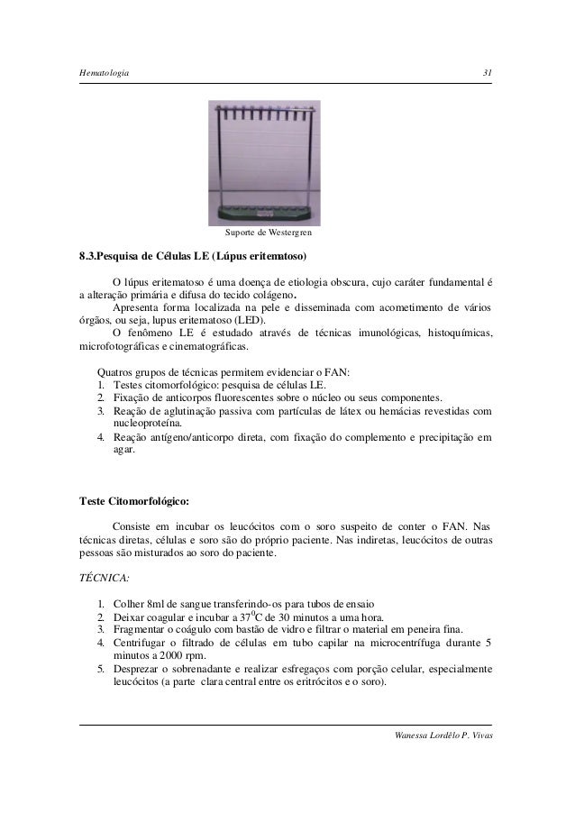 31. 31. Hematologia 31 Suporte de Westergren8.3.Pesquisa de Células LE (Lúpus eritematoso) O lúpus eritematoso é uma doença de etiologia obscura, cujo caráter fundamental éa alteração primária e difusa do tecido colágeno. Apresenta forma localizada na pele e disseminada com acometimento de váriosórgãos, ou seja, lupus eritematoso (LED). O fenômeno LE é estudado através de técnicas imunológicas, histoquímicas,microfotográficas e cinematográficas. Quatros grupos de técnicas permitem evidenciar o FAN: 1. Testes citomorfológico: pesquisa de células LE. 2. Fixação de anticorpos fluorescentes sobre o núcleo ou seus componentes. 3. Reação de aglutinação passiva com partículas de látex ou hemácias revestidas com nucleoproteína. 4. Reação antígeno/anticorpo direta, com fixação do complemento e precipitação em agar.Teste Citomorfológico: Consiste em incubar os leucócitos com o soro suspeito de conter o FAN. Nastécnicas diretas, células e soro são do próprio paciente. Nas indiretas, leucócitos de outraspessoas são misturados ao soro do paciente.TÉCNICA: 1. Colher 8ml de sangue transferindo-os para tubos de ensaio 2. Deixar coagular e incubar a 370C de 30 minutos a uma hora. 3. Fragmentar o coágulo com bastão de vidro e filtrar o material em peneira fina. 4. Centrifugar o filtrado de células em tubo capilar na microcentrífuga durante 5 minutos a 2000 rpm. 5. Desprezar o sobrenadante e realizar esfregaços com porção celular, especialmente leucócitos (a parte clara central entre os eritrócitos e o soro). Wanessa Lordêlo P. Vivas