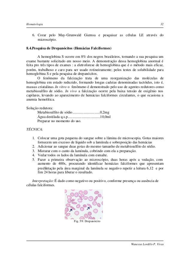 32. 32. Hematologia 32 6. Corar pelo May-Grunwald Giemsa e pesquisar as células LE através do microscópio.8.4.Pesquisa de Drepanócitos (Hemácias Falciformes) A hemoglobina S ocorre em 8% dos negros brasileiros, tornando a sua pesquisa umexame bastante solicitado em nosso meio. A demonstração dessa hemoglobina anormal éfeita pro três tipos de exames : a eletroforese de hemoglobina que é o método mais eficaz,porém, trabalhoso e caro para ser usado rotineiramente; pelos testes de solubilidade parahemoglobina S e pela pesquisa de drepanócitos. O fenômeno da falcização trata de uma reorganização das moléculas dehemoglobina em estado reduzido, formando longas cadeias denominadas tactóides, isto é,massas criatalinas. In vitro o fenômeno é demonstrado pelo uso de agentes redutores comometabissulfito de sódio. In vivo a falcização ocorre pela baixa tensão de oxigênio noscapilares, levando ao aparecimento de hemácias falciformes circulantes, o que ocasiona aanemia hemolítica.Solução redutora: Metabissulfito de sódio..............................0,2mg Água destilada q.s.p...................................10,0ml Preparar no momento do uso.TÉCNICA: 1. Colocar uma gota pequena do sangue sobre a lâmina de microscopia. Gotas maiores fornecem um excesso de líquido sob a lamínula e sobreposição das hemácias 2. Adicionar ao sangue duas gotas do mesmo tamanho de metabissulfito de sódio. 3. Misturar com o canto da lamínula, cobrindo com ela a preparação. 4. Vedar todos os lados da lamínula com esmalte. 5. Fazer a primeira observação ao microscópio, duas horas após a vedação, com aumento de 400x, procurando identificar hemácias falciformes que apresentam prediletação pela área marginal da lamínula se negativo repetir a leitura 6,12 e por fim 24 horas para liberar o resultado. Interpretação: É dado como negativo ou positivo, conforme presença ou ausência decélulas falciformes. Fig. 59: Drepanócito Wanessa Lordêlo P. Vivas