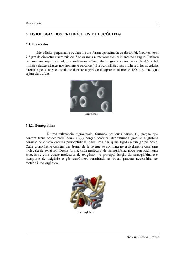 4. 4. Hematologia 43. FISIOLOGIA DOS ERITRÓCITOS E LEUCÓCITOS3.1. Eritrócitos São células pequenas, circulares, com forma aproximada de discos bicôncavos, com7,5 µm de diâmetro e sem núcleo. São os mais numerosos tios celulares no sangue. Emboraseu número seja variável, um milímetro cúbico de sangue contém cerca de 4.5 a 6.1milhões dessas células nos homens e cerca de 4.1 a 5.3 milhões nas mulheres. Essas célulascirculam pelo sangue circulante durante o período de aproximadamente 120 dias antes quesejam destruídas. Eritrócitos3.1.2. Hemoglobina É uma substância pigmentada, formada por duas partes: (1) porção quecontém ferro denominada heme e (2) porção protéica, denominada globina.A globinaconsiste de quatro cadeias polipeptídicas, cada uma das quais ligada a um grupo heme.Cada grupo heme contém um átomo de ferro que se combina reversivelmente com umamolécula de oxigênio. Dessa forma, cada molécula de hemoglobina pode potencialmenteassociar-se com quatro moléculas de oxigênio. A principal função da hemoglobina e otransporte de oxigênio e gás carbônico, permitindo as trocas gasosas necessárias aometabolismo orgânico. Hemoglobina Wanessa Lordêlo P. Vivas