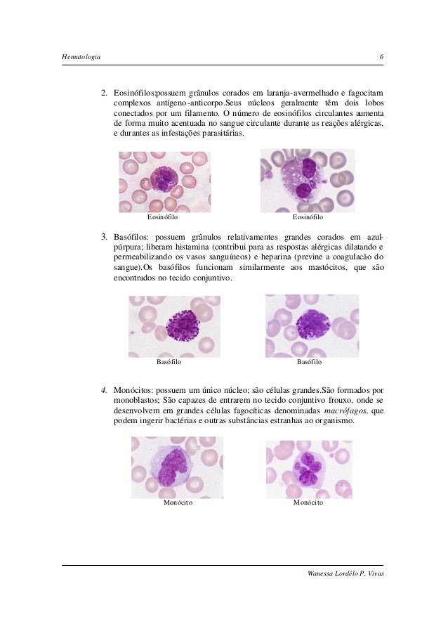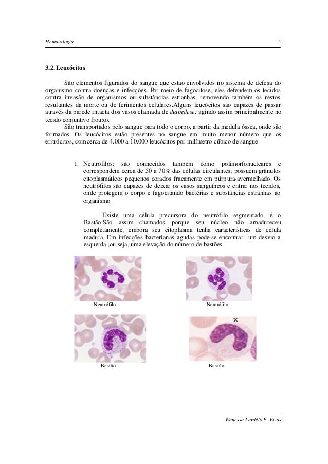 5. 5. Hematologia 53.2. Leucócitos São elementos figurados do sangue que estão envolvidos no sistema de defesa doorganismo contra doenças e infecções. Por meio de fagocitose, eles defendem os tecidoscontra invasão de organismos ou substâncias estranhas, removendo também os restosresultantes da morte ou de ferimentos celulares.Alguns leucócitos são capazes de passaratravés da parede intacta dos vasos chamada de diapedese; agindo assim principalmente notecido conjuntivo frouxo. São transportados pelo sangue para todo o corpo, a partir da medula óssea, onde sãoformados. Os leucócitos estão presentes no sangue em muito menor número que oseritrócitos, com cerca de 4.000 a 10.000 leucócitos por milímetro cúbico de sangue. 1. Neutrófilos: são conhecidos também como polimorfonucleares e correspondem cerca de 50 a 70% das células circulantes; possuem grânulos citoplasmáticos pequenos corados fracamente em púrp ura-avermelhado. Os neutrófilos são capazes de deixar os vasos sanguíneos e entrar nos tecidos, onde protegem o corpo e fagocitando bactérias e substâncias estranhas ao organismo. Existe uma célula precursora do neutrófilo segmentado, é o Bastão.São assim chamados porque seu núcleo não amadureceu completamente, embora seu citoplasma tenha características de célula madura. Em infecções bacterianas agudas pode-se encontrar um desvio a esquerda ,ou seja, uma elevação do número de bastões. Neutrófilo Neutrófilo Bastão Bastão Wanessa Lordêlo P. Vivas