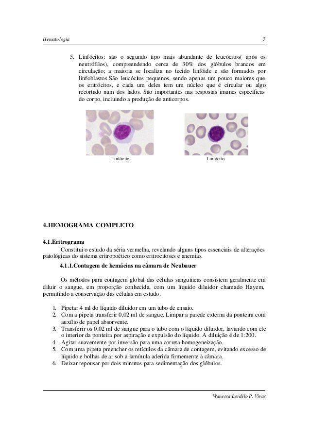 7. 7. Hematologia 7 5. Linfócitos: são o segundo tipo mais abundante de leucócitos( após os neutrófilos), compreendendo cerca de 30% dos glóbulos brancos em circulação; a maioria se localiza no tecido linfóide e são formados por linfoblastos.São leucócitos pequenos, sendo apenas um pouco maiores que os eritrócitos, e cada um deles tem um núcleo que é circular ou algo recortado num dos lados. São importantes nas respostas imunes específicas do corpo, incluindo a produção de anticorpos. Linfócito Linfócito4.HEMOGRAMA COMPLETO4.1.Eritrograma Constitui o estudo da séria vermelha, revelando alguns tipos essenciais de alteraçõespatológicas do sistema eritropoético como eritrocitoses e anemias. 4.1.1.Contagem de hemácias na câmara de Neubauer Os métodos para contagem global das células sanguíneas consistem geralmente emdiluir o sangue, em proporção conhecida, com um líquido diluidor chamado Hayem,permitindo a conservação das células em estudo. 1. Pipetar 4 ml do líquido diluidor em um tubo de ensaio. 2. Com a pipeta transferir 0,02 ml de sangue. Limpar a parede externa da ponteira com auxílio de papel absorvente. 3. Transferir os 0,02 ml de sangue para o tubo com o líquido diluidor, lavando com ele o interior da ponteira por aspiração e expulsão do líquido. A diluição é de 1:200. 4. Agitar suavemente por inversão para uma correta homogeneização. 5. Com uma pipeta preencher os retículos da câmara de contagem, evitando excesso de líquido e bolhas de ar sob a lamínula aderida firmemente à câmara. 6. Deixar repousar por dois minutos para sedimentação dos glóbulos. Wanessa Lordêlo P. Vivas