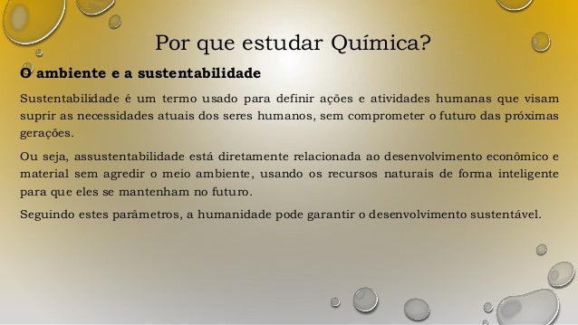 10. 10. Por que estudar Química? O ambiente e a sustentabilidade Sustentabilidade é um termo usado para definir ações e atividades humanas que visam suprir as necessidades atuais dos seres humanos, sem comprometer o futuro das próximas gerações. Ou seja, assustentabilidade está diretamente relacionada ao desenvolvimento econômico e material sem agredir o meio ambiente, usando os recursos naturais de forma inteligente para que eles se mantenham no futuro. Seguindo estes parâmetros, a humanidade pode garantir o desenvolvimento sustentável.