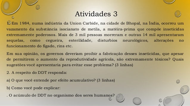 12. 12. Atividades 3 1. Em 1984, numa indústria da Union Carbide, na cidade de Bhopal, na Índia, ocorreu um vazamento da substância isocianato de metila, a matéira-prima que compõe inseticidas extremamente poderosos. Mais de 3 mil pessoas morreram e outras 14 mil apresentaram sequelas, como cegueira, esterilidade, disturbios neurológicos, alterações no funcionamento do fígado, rins etc. Em sua opinião, os governos deveriam proibir a fabricação desses inseticidas, que apesar de permitirem o aumento da reprodutividade agrícola, são extremamente tóxicos? Quais sugestões você apresentaria para evitar esse problema? (3 linhas) 2. A respeito do DDT responda: a) O que você entende por efeito acumulativo? (3 linhas) b) Como você pode explicar: . O acúmulo de DDT no organismo dos seres humanos?