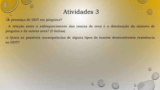 13. 13. Atividades 3 . A presença de DDT em pinguins? . A relação entre o enfraquecimento das cascas de ovos e a diminuição do número de pinguins e de outras aves? (5 linhas) c) Quais as possíveis consequências de alguns tipos de insetos desenvolverem resistência ao DDT?