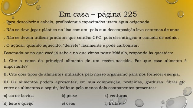 15. 15. Em casa – página 225 . Para descolorir o cabelo, profissionais capacitados usam água oxigenada. . Não se deve jogar plástico no lixo comum, pois sua decomposição leva centenas de anos. . Não se devem utilizar produtos que contêm CFC, pois eles atingem a camada de ozônio. . O açúcar, quando aquecido, “derrete” facilmente e pode carbonizar. Basenado-se no que você já sabe e no que vimos neste Módulo, responda às questões: I. Cite o nome do principal alimento de um recém-nascido. Por que esse alimento é importante? II. Cite dois tipos de alimentos utilizados pelo nosso organismo para nos fornecer energia. III. Os alimentos podem apresentar, em sua composição, proteínas, gorduras, fibras etc. entre os alimentos a seguir, indique pelo menos dois componentes presentes: a) carne bovina b) peixe c) verduras d) leite e queijo e) ovos f) frutas