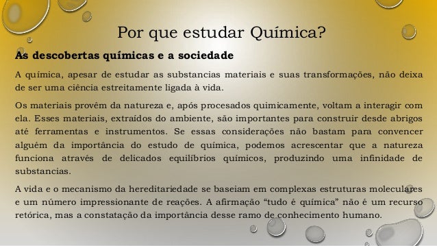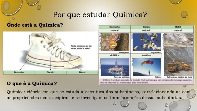 2. 2. Por que estudar Química? Onde está a Química? O que é a Química? Química: ciência em que se estuda a estrutura das substâncias, correlacionando-as com as propriedades macroscópicas, e se investigam as transformações dessas substâncias.