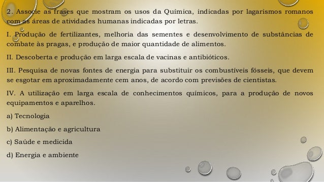 2. Associe as frases que mostram os usos da Química, indicadas por lagarismos romanos