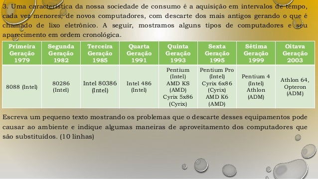 6. 6. 3. Uma característica da nossa sociedade de consumo é a aquisição em intervalos de tempo, cada vez menores, de novos computadores, com descarte dos mais antigos gerando o que é chamado de lixo eletrônico. A seguir, mostramos alguns tipos de computadores e seu aparecimento em ordem cronológica. Escreva um pequeno texto mostrando os problemas que o descarte desses equipamentos pode causar ao ambiente e indique algumas maneiras de aproveitamento dos computadores que são substituídos. (10 linhas) Primeira Geração 1979 Segunda Geração 1982 Terceira Geração 1985 Quarta Geração 1991 Quinta Geração 1993 Sexta Geração 1995 Sétima Geração 1999 Oitava Geração 2003 8088 (Intel) 80286 (Intel) Intel 80386 (Intel) Intel 486 (Intel) Pentium (Intel) AMD KS (AMD) Cyrix 5x86 (Cyrix) Pentium Pro (Intel) Cyrix 6x86 (Cyrix) AMD K6 (AMD) Pentium 4 (Intel) Athlon (ADM) Athlon 64, Opteron (ADM)