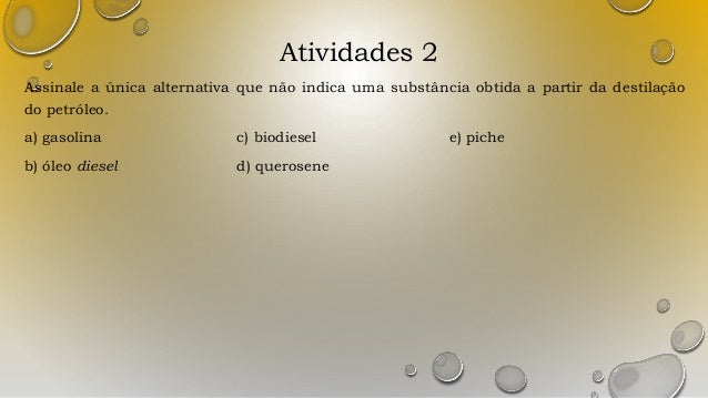 8. 8. Atividades 2 Assinale a única alternativa que não indica uma substância obtida a partir da destilação do petróleo. a) gasolina c) biodiesel e) piche b) óleo diesel d) querosene