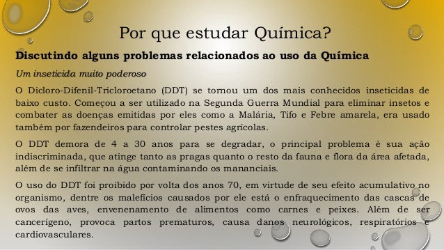 9. 9. Por que estudar Química? Discutindo alguns problemas relacionados ao uso da Química Um inseticida muito poderoso O Dicloro-Difenil-Tricloroetano (DDT) se tornou um dos mais conhecidos inseticidas de baixo custo. Começou a ser utilizado na Segunda Guerra Mundial para eliminar insetos e combater as doenças emitidas por eles como a Malária, Tifo e Febre amarela, era usado também por fazendeiros para controlar pestes agrícolas. O DDT demora de 4 a 30 anos para se degradar, o principal problema é sua ação indiscriminada, que atinge tanto as pragas quanto o resto da fauna e flora da área afetada, além de se infiltrar na água contaminando os mananciais. O uso do DDT foi proibido por volta dos anos 70, em virtude de seu efeito acumulativo no organismo, dentre os malefícios causados por ele está o enfraquecimento das cascas de ovos das aves, envenenamento de alimentos como carnes e peixes. Além de ser cancerígeno, provoca partos prematuros, causa danos neurológicos, respiratórios e cardiovasculares.