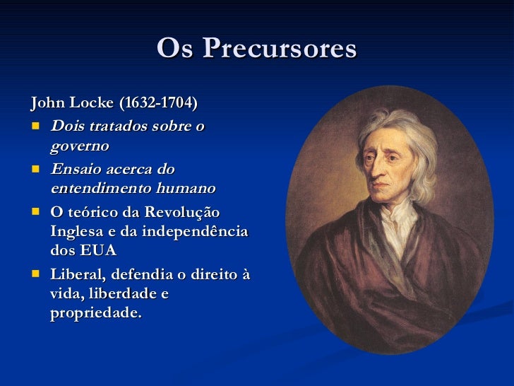 10. 10. Os Precursores <ul><li>John Locke (1632-1704) </li></ul><ul><li>Dois tratados sobre o governo </li></ul><ul><li>Ensaio acerca do entendimento humano </li></ul><ul><li>O teórico da Revolução Inglesa e da independência dos EUA </li></ul><ul><li>Liberal, defendia o direito à vida, liberdade e propriedade. </li></ul>