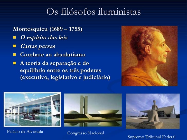 11. 11. Os filósofos iluministas <ul><li>Montesquieu (1689 – 1755) </li></ul><ul><li>O espírito das leis </li></ul><ul><li>Cartas persas </li></ul><ul><li>Combate ao absolutismo </li></ul><ul><li>A teoria da separação e do equilíbrio entre os três poderes (executivo, legislativo e judiciário) </li></ul>Palácio da Alvorada Congresso Nacional Supremo Tribunal Federal