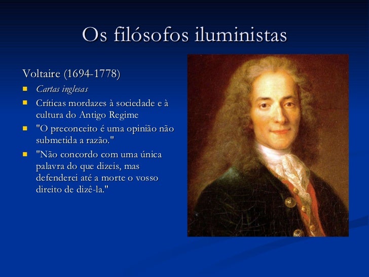 12. 12. Os filósofos iluministas <ul><li>Voltaire (1694-1778) </li></ul><ul><li>Cartas inglesas </li></ul><ul><li>Críticas mordazes à sociedade e à cultura do Antigo Regime </li></ul><ul><li>&quot;O preconceito é uma opinião não submetida a razão.&quot; </li></ul><ul><li>&quot;Não concordo com uma única palavra do que dizeis, mas defenderei até a morte o vosso direito de dizê-la.&quot; </li></ul>