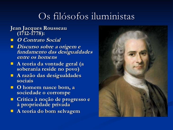 15. 15. Os filósofos iluministas <ul><li>Jean Jacques Rousseau (1712-1778): </li></ul><ul><li>O Contrato Social </li></ul><ul><li>Discurso sobre a origem e fundamento das desigualdades entre os homens </li></ul><ul><li>A teoria da vontade geral (a soberania reside no povo) </li></ul><ul><li>A razão das desigualdades sociais </li></ul><ul><li>O homem nasce bom, a sociedade o corrompe </li></ul><ul><li>Crítica à noção de progresso e à propriedade privada </li></ul><ul><li>A teoria do bom selvagem </li></ul>
