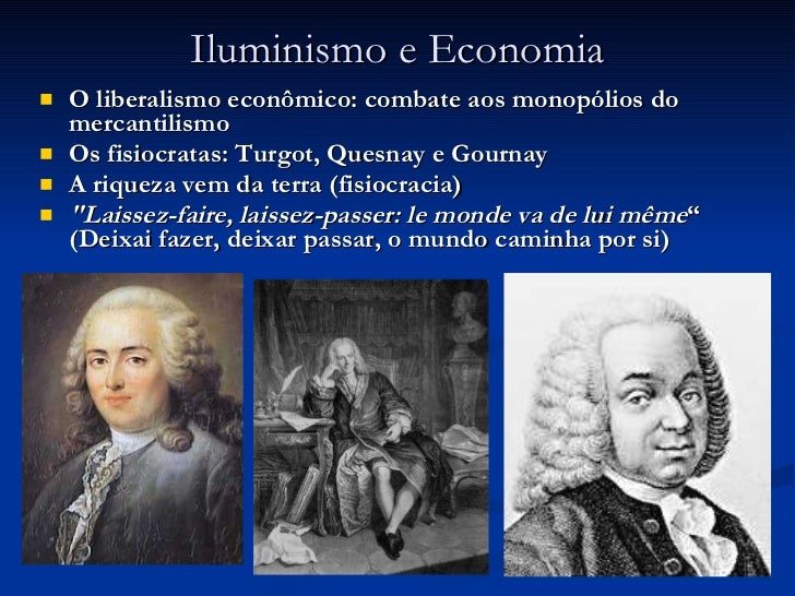 16. 16. Iluminismo e Economia <ul><li>O liberalismo econômico: combate aos monopólios do mercantilismo </li></ul><ul><li>Os fisiocratas: Turgot, Quesnay e Gournay </li></ul><ul><li>A riqueza vem da terra (fisiocracia) </li></ul><ul><li>&quot;Laissez-faire, laissez-passer: le monde va de lui même “ (Deixai fazer, deixar passar, o mundo caminha por si) </li></ul>