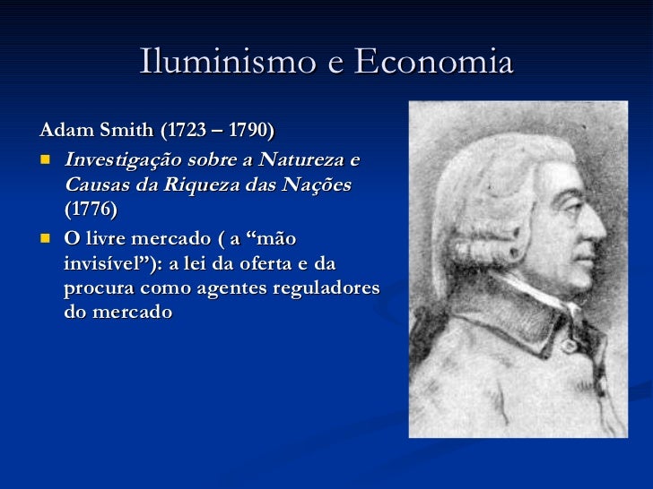 18. 18. Iluminismo e Economia <ul><li>Adam Smith (1723 – 1790) </li></ul><ul><li>Investigação sobre a Natureza e Causas da Riqueza das Nações (1776) </li></ul><ul><li>O livre mercado ( a “mão invisível”): a lei da oferta e da procura como agentes reguladores do mercado </li></ul>