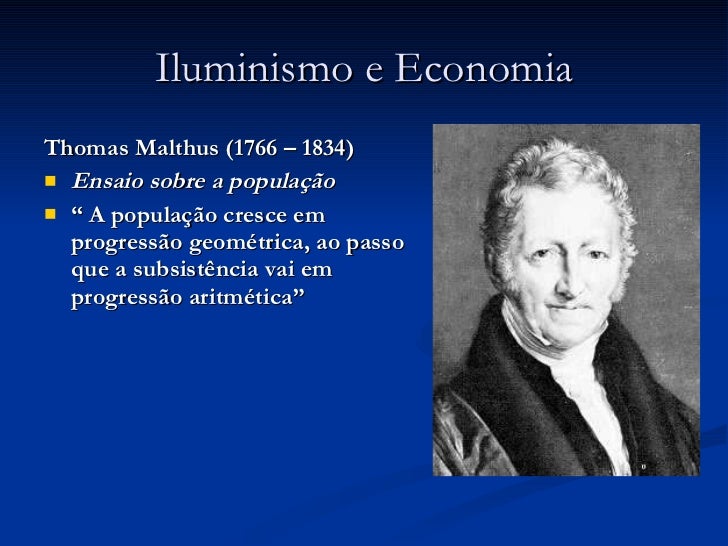 19. 19. Iluminismo e Economia <ul><li>Thomas Malthus (1766 – 1834) </li></ul><ul><li>Ensaio sobre a população </li></ul><ul><li>“ A população cresce em progressão geométrica, ao passo que a subsistência vai em progressão aritmética” </li></ul>