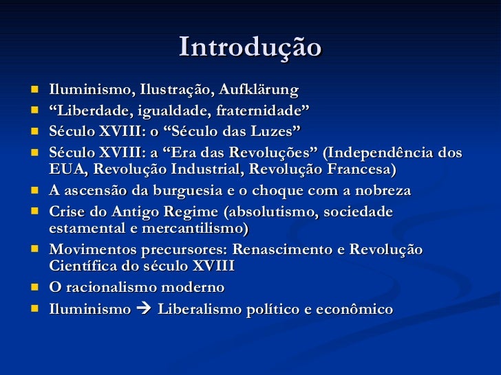 2. 2. Introdução <ul><li>Iluminismo, Ilustração, Aufklärung </li></ul><ul><li>“ Liberdade, igualdade, fraternidade” </li></ul><ul><li>Século XVIII: o “Século das Luzes” </li></ul><ul><li>Século XVIII: a “Era das Revoluções” (Independência dos EUA, Revolução Industrial, Revolução Francesa) </li></ul><ul><li>A ascensão da burguesia e o choque com a nobreza </li></ul><ul><li>Crise do Antigo Regime (absolutismo, sociedade estamental e mercantilismo) </li></ul><ul><li>Movimentos precursores: Renascimento e Revolução Científica do século XVIII </li></ul><ul><li>O racionalismo moderno </li></ul><ul><li>Iluminismo  Liberalismo político e econômico </li></ul>