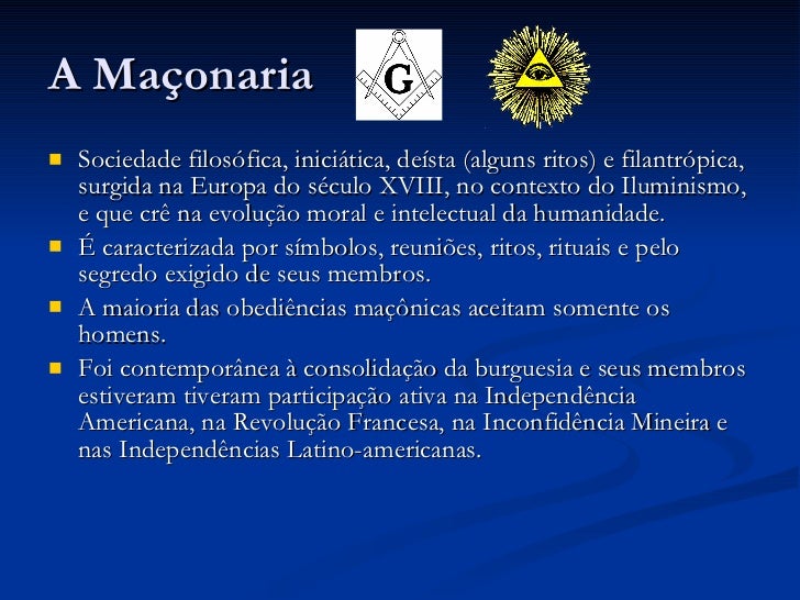 25. 25. A Maçonaria <ul><li>Sociedade filosófica, iniciática, deísta (alguns ritos) e filantrópica, surgida na Europa do século XVIII, no contexto do Iluminismo, e que crê na evolução moral e intelectual da humanidade. </li></ul><ul><li>É caracterizada por símbolos, reuniões, ritos, rituais e pelo segredo exigido de seus membros. </li></ul><ul><li>A maioria das obediências maçônicas aceitam somente os homens. </li></ul><ul><li>Foi contemporânea à consolidação da burguesia e seus membros estiveram tiveram participação ativa na Independência Americana, na Revolução Francesa, na Inconfidência Mineira e nas Independências Latino-americanas. </li></ul>