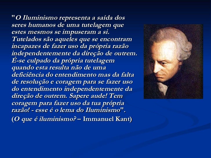 4. 4. <ul><li>&quot; O Iluminismo representa a saída dos seres humanos de uma tutelagem que estes mesmos se impuseram a si. Tutelados são aqueles que se encontram incapazes de fazer uso da própria razão independentemente da direção de outrem. É-se culpado da própria tutelagem quando esta resulta não de uma deficiência do entendimento mas da falta de resolução e coragem para se fazer uso do entendimento independentemente da direção de outrem. Sapere aude! Tem coragem para fazer uso da tua própria razão! - esse é o lema do Iluminismo &quot;. </li></ul><ul><li>( O que é iluminismo? – Immanuel Kant) </li></ul>