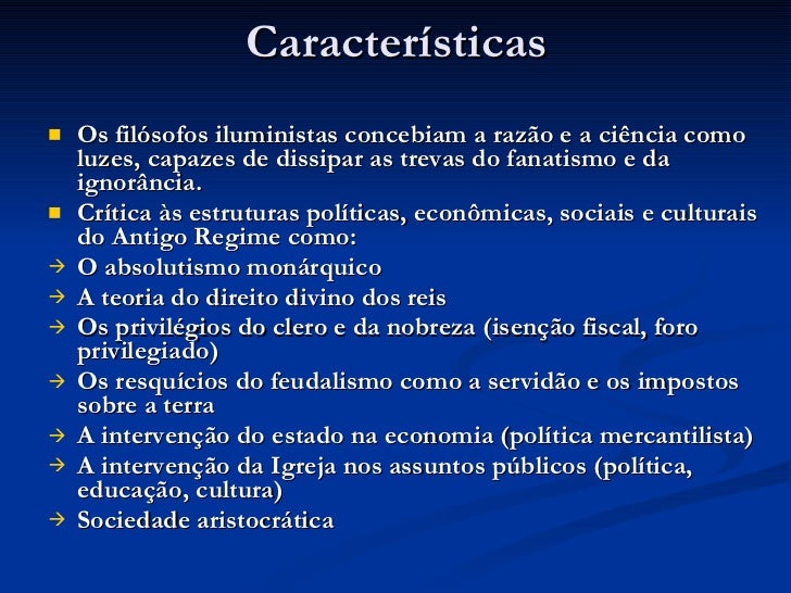 5. 5. Características <ul><li>Os filósofos iluministas concebiam a razão e a ciência como luzes, capazes de dissipar as trevas do fanatismo e da ignorância. </li></ul><ul><li>Crítica às estruturas políticas, econômicas, sociais e culturais do Antigo Regime como: </li></ul><ul><li>O absolutismo monárquico </li></ul><ul><li>A teoria do direito divino dos reis </li></ul><ul><li>Os privilégios do clero e da nobreza (isenção fiscal, foro privilegiado) </li></ul><ul><li>Os resquícios do feudalismo como a servidão e os impostos sobre a terra </li></ul><ul><li>A intervenção do estado na economia (política mercantilista) </li></ul><ul><li>A intervenção da Igreja nos assuntos públicos (política, educação, cultura) </li></ul><ul><li>Sociedade aristocrática </li></ul>