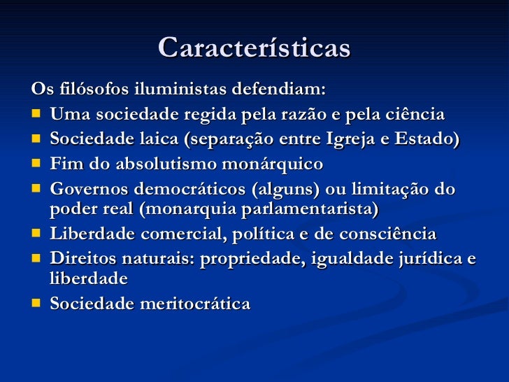 6. 6. Características <ul><li>Os filósofos iluministas defendiam: </li></ul><ul><li>Uma sociedade regida pela razão e pela ciência </li></ul><ul><li>Sociedade laica (separação entre Igreja e Estado) </li></ul><ul><li>Fim do absolutismo monárquico </li></ul><ul><li>Governos democráticos (alguns) ou limitação do poder real (monarquia parlamentarista) </li></ul><ul><li>Liberdade comercial, política e de consciência </li></ul><ul><li>Direitos naturais: propriedade, igualdade jurídica e liberdade </li></ul><ul><li>Sociedade meritocrática </li></ul>