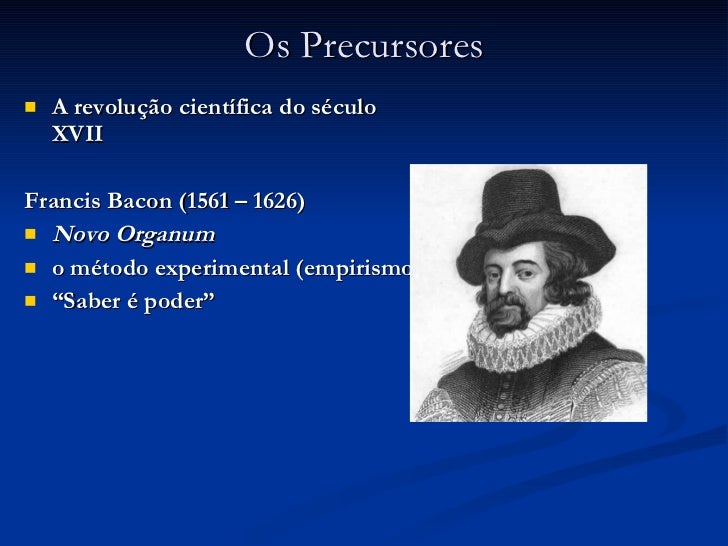 7. 7. Os Precursores <ul><li>A revolução científica do século XVII </li></ul><ul><li>Francis Bacon (1561 – 1626) </li></ul><ul><li>Novo Organum </li></ul><ul><li>o método experimental (empirismo) </li></ul><ul><li>“ Saber é poder” </li></ul>