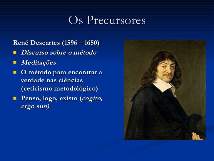 8. 8. Os Precursores <ul><li>René Descartes (1596 – 1650) </li></ul><ul><li>Discurso sobre o método </li></ul><ul><li>Meditações </li></ul><ul><li>O método para encontrar a verdade nas ciências (ceticismo metodológico) </li></ul><ul><li>Penso, logo, existo ( cogito, ergo sun) </li></ul>