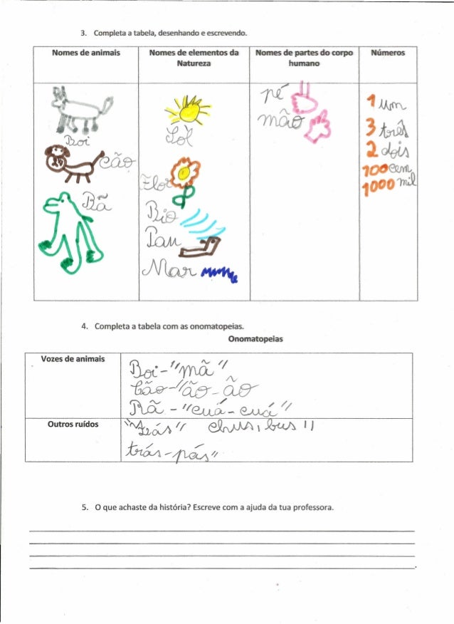 2. 2. ~~--~-~-~------------------------------------------ 3. Completa a tabela, desenhando e escrevendo. Nomes de elementos da' Natureza NúmertlSNomes de animais Nomes de partes do corpo humano 4. Completa a tabela com as orromatcpeias. Onomatopeias Vozes de animais Outros ruídos I J 5. O que achaste da história? Escreve com a ajuda da tua professora.