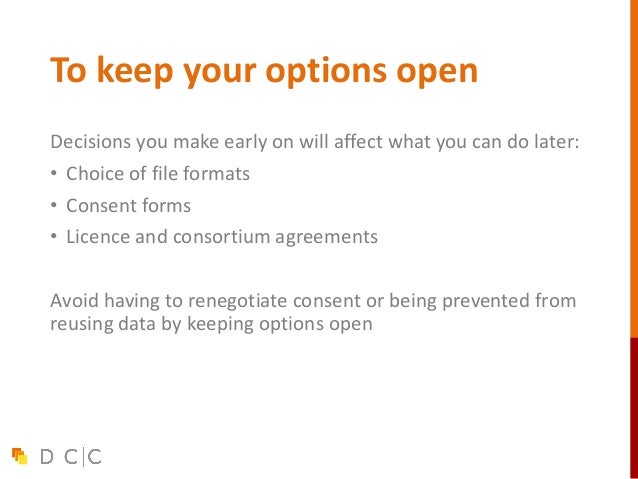 11. 11. To keep your options open Decisions you make early on will affect what you can do later: • Choice of file formats • Consent forms • Licence and consortium agreements Avoid having to renegotiate consent or being prevented from reusing data by keeping options open
